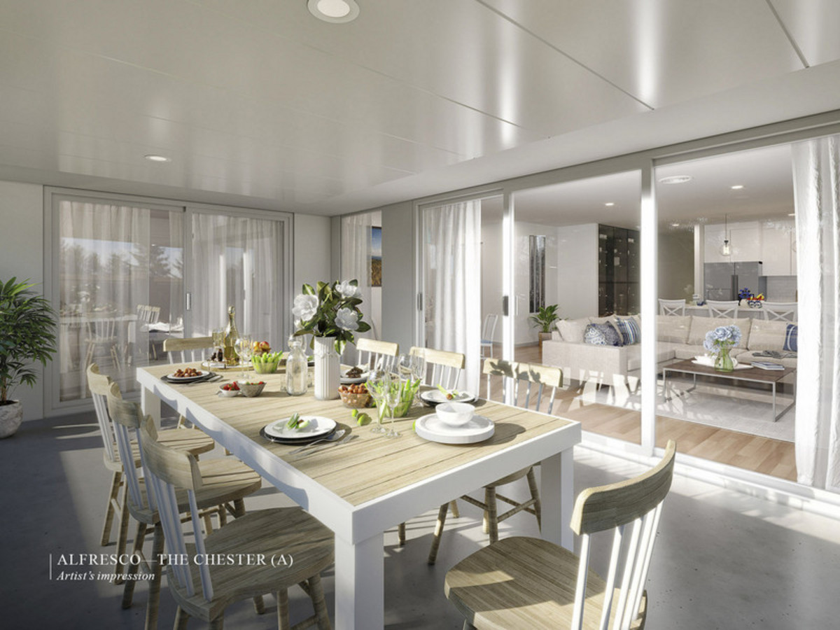 The delightful Laguna design is a classic modern home, with a floorplan offering intelligently zoned living including indoor and outdoor entertaining areas.The contemporary 3-bedroom design offers light and airy open-plan living and dining areas, including a kitchen with double sink, and an extended island benchtop. Living and dining areas are generously proportioned, as are the second and third bedrooms with separate bathroom. Positioned at the rear of the property to maximise privacy and minimise noise, the master bedroom features a private ensuite, plus sliding doors that open onto the enormous outdoor alfresco terrace, covered for year-round use.